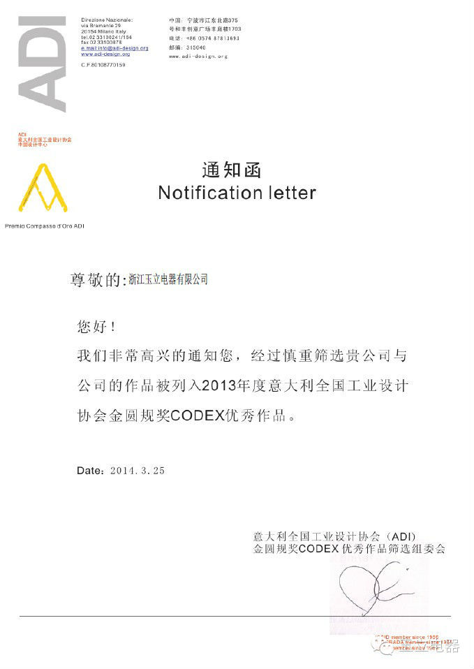 不無巧合,玉立創(chuàng)始于1954年與ADI金圓規(guī)獎項1954創(chuàng)立同一年而生,玉立電器正是憑借60年的歷史和精湛的工業(yè)制造技術榮獲意大利全國工業(yè)設計協(xié)會金圓規(guī)獎CODEX優(yōu)秀作品大獎。